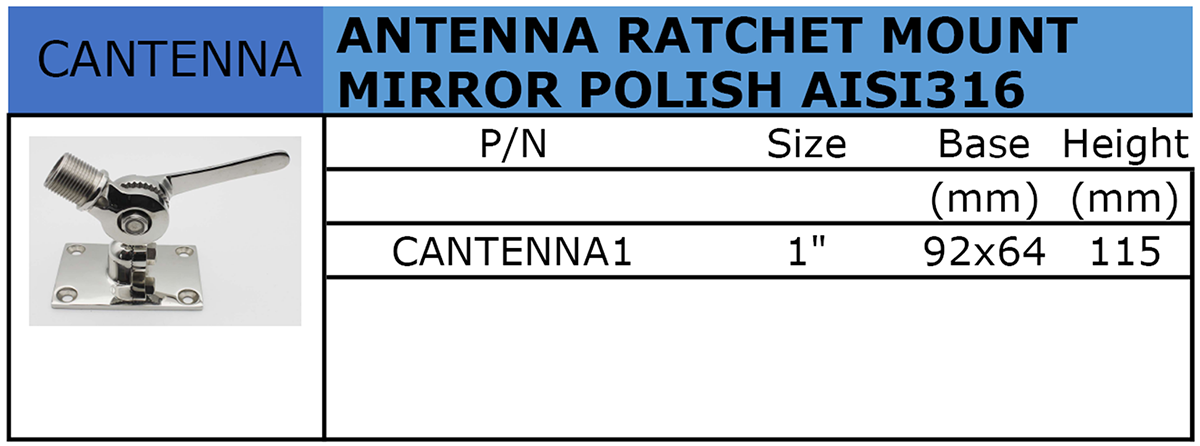 Stainless steel antenna ratchet mount base for GPS and VHF antennas. 316 Marine grade stainless steel is used extensively on yachts and boats, offering high corrosion resistance.
